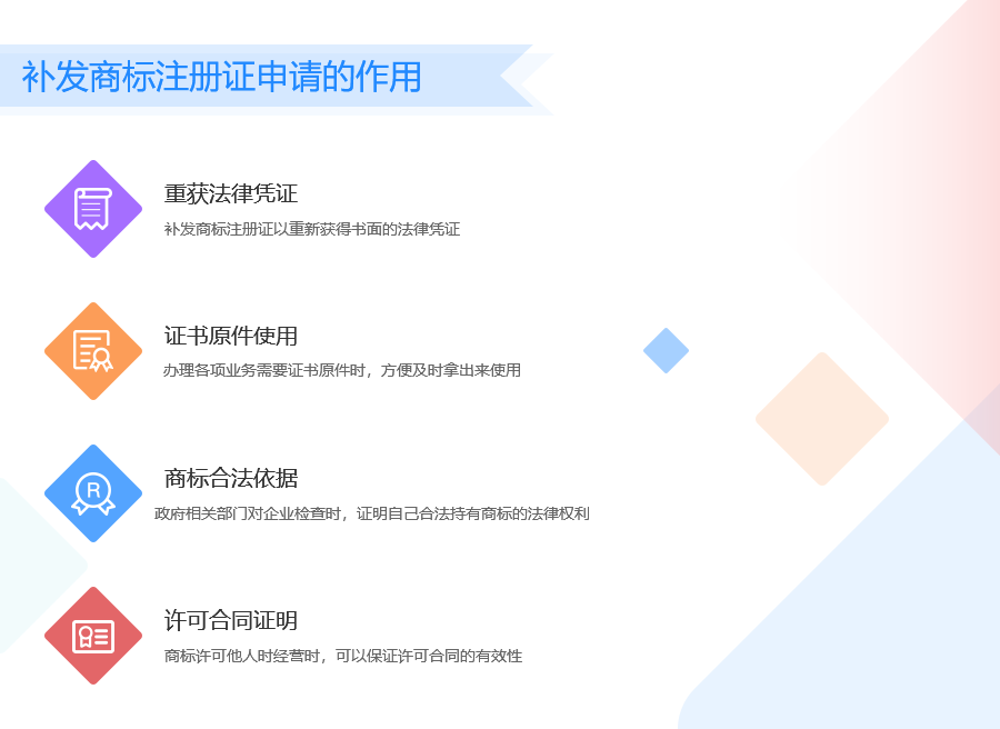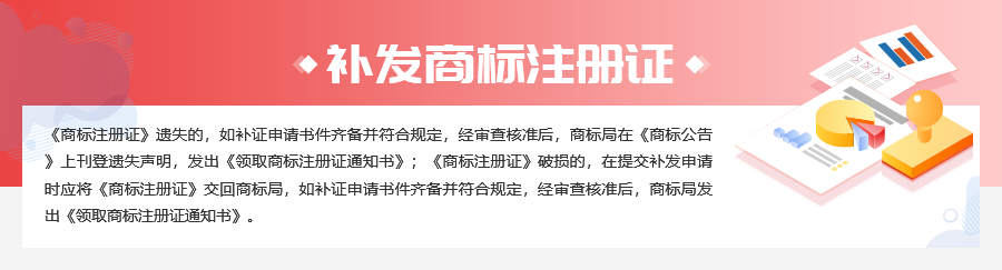《商标注册证》遗失或者破损的,商标注册人应提出补发商标注册证申请,及时申请补发