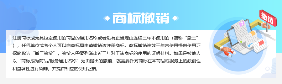 (2)如果被以通用名称进行撤销,举证责任重点在于撤销申请一方。作为答辩方,可以列举自己的使用证明和商标显著性的证明进行答辩,加大自己获胜的机会。但是如果撤销申请方所列举的证据和理由根本无法证明商标是通用名称的,即使被撤销人不进行答辩,也会获胜。