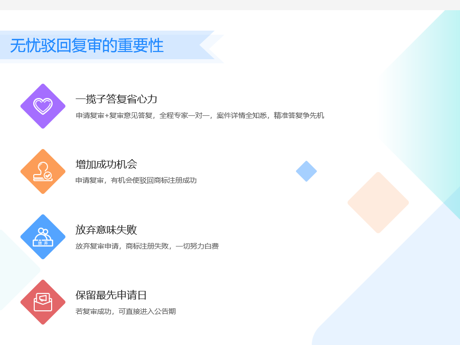 (3)商标驳回复审可以保留最早的申请时间,通过后续的撤销或无效程序,排除掉障碍商标后,可以使申请商标获得注册。