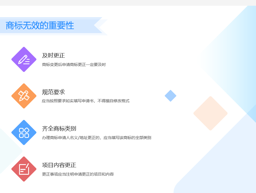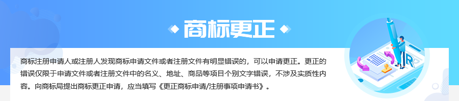 商标更正分为实质性错误与非实质性错误。实质性错误通常因申请人原因,导致注册人名义、权利客体即商标、或者申请注册商标所使用的商品或服务发生重大变化,或导致申请人或注册人名义不同,与申请人原本欲申请注册商标所使用的商品或服务不同等。不涉及以上情况为非实质性错误,如申请人名义中的字号填写有误的,应当由申请人请求变更名义;再如,如果申请书上的商标不是申请人需要申请注册的商标,并且申请人需要更换的,应当由申请人另行提出商标注册申请。