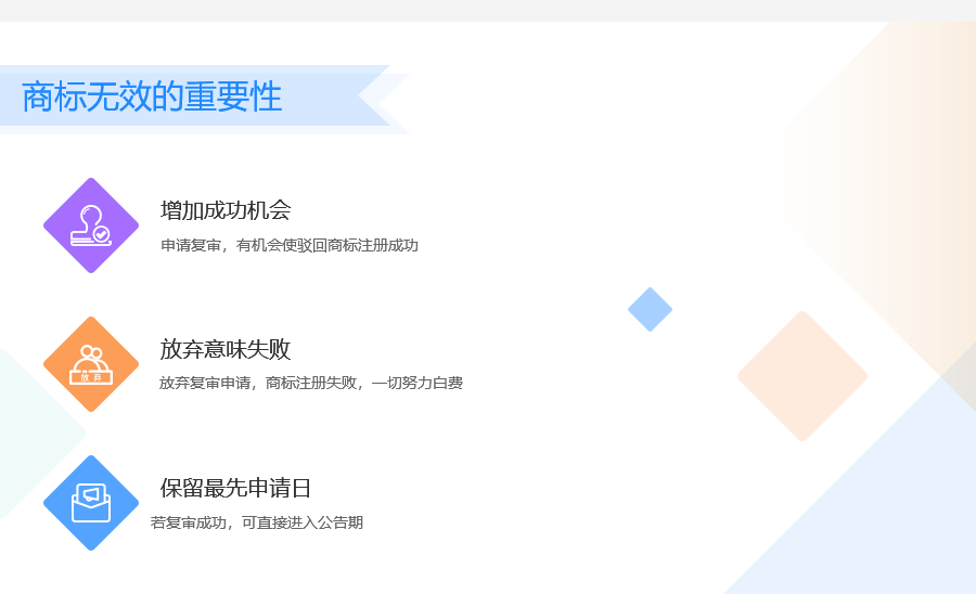 (3)商标驳回复审可以保留最早的申请时间,通过后续的撤销或无效程序,排除掉障碍商标后,可以使申请商标获得注册。